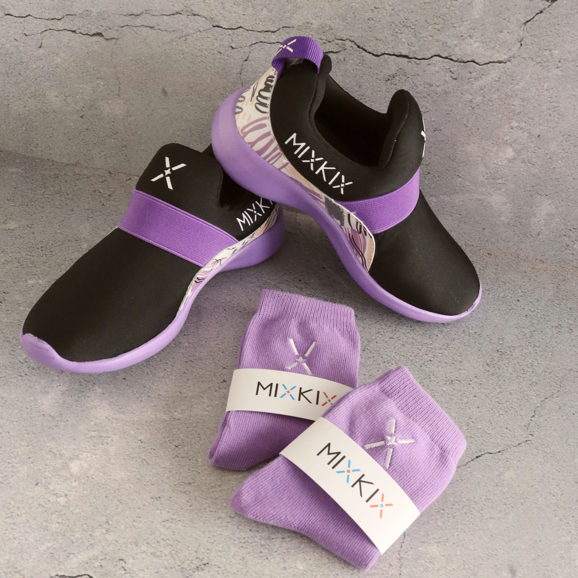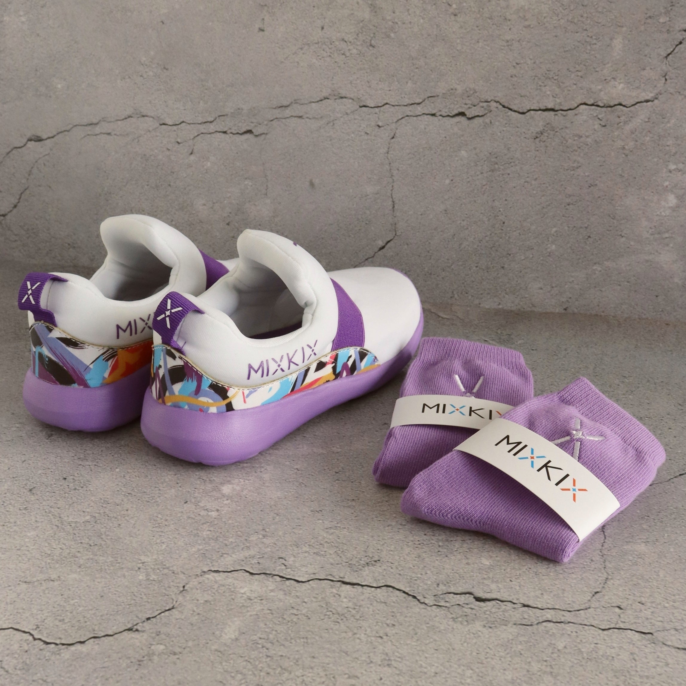 Girl fashion styling wearing purple Mix Kix kids slip-on shoes and coordinated cotton socks.