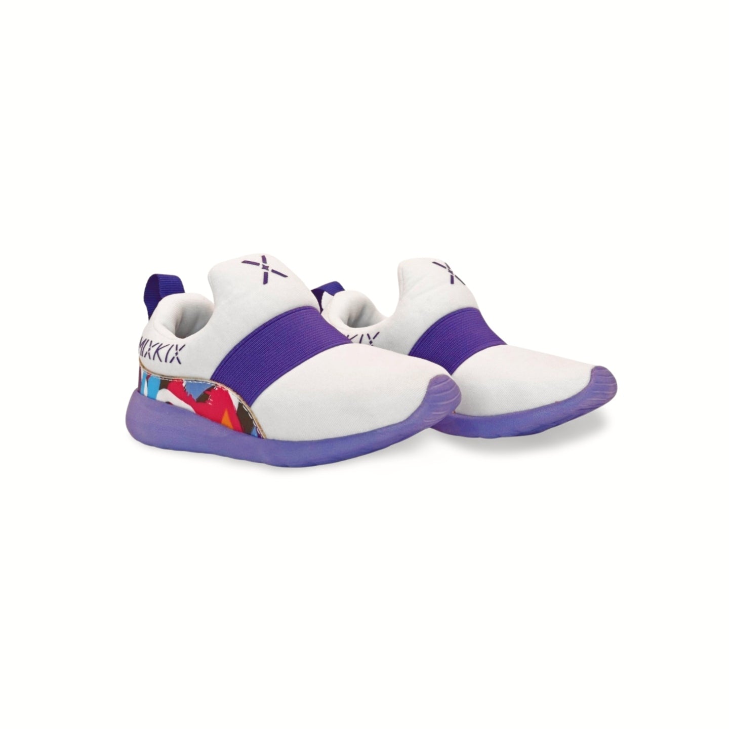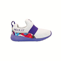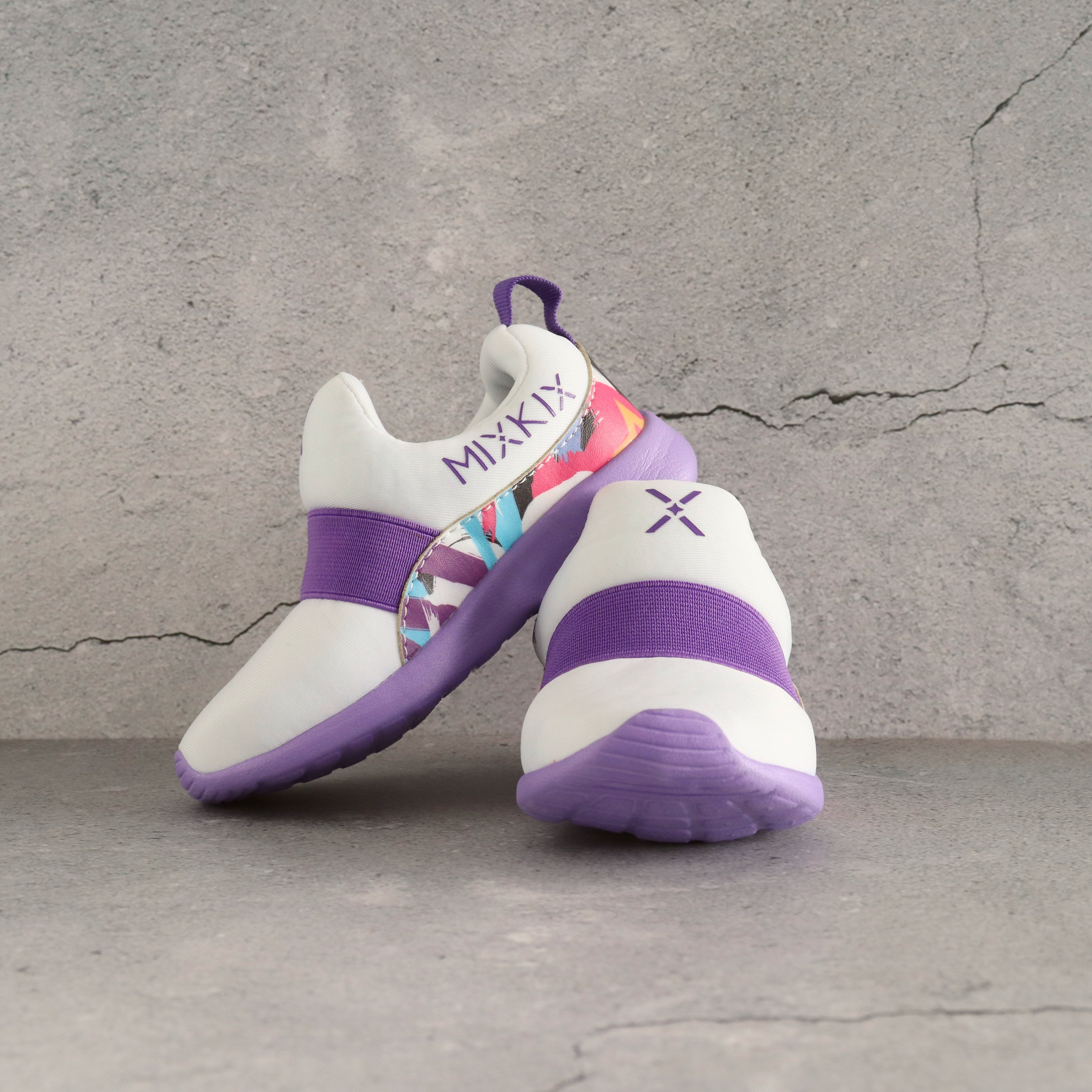 Girl fashion styling wearing purple Mix Kix kids slip-on shoes and coordinated cotton socks.