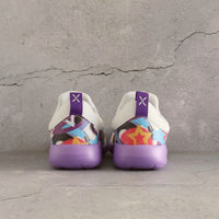 Slip-on supportive footwear for growing feet. Sneakers in black and purple with retro 90s print.