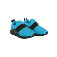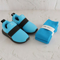 Boy fashion styling wearing aqua blue no-lace supportive sneakers and cotton slouch socks by Mix Kix.