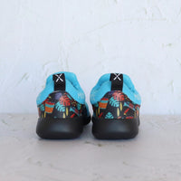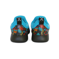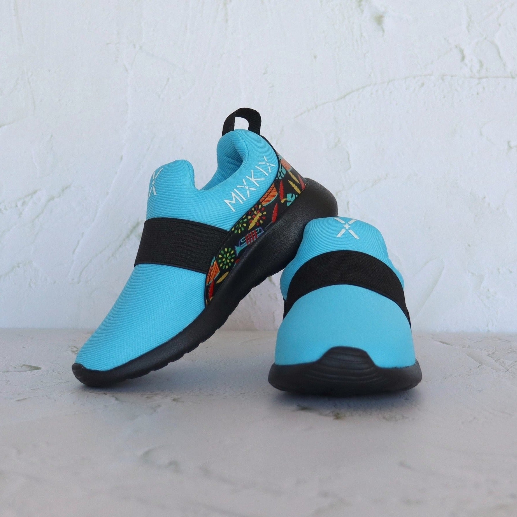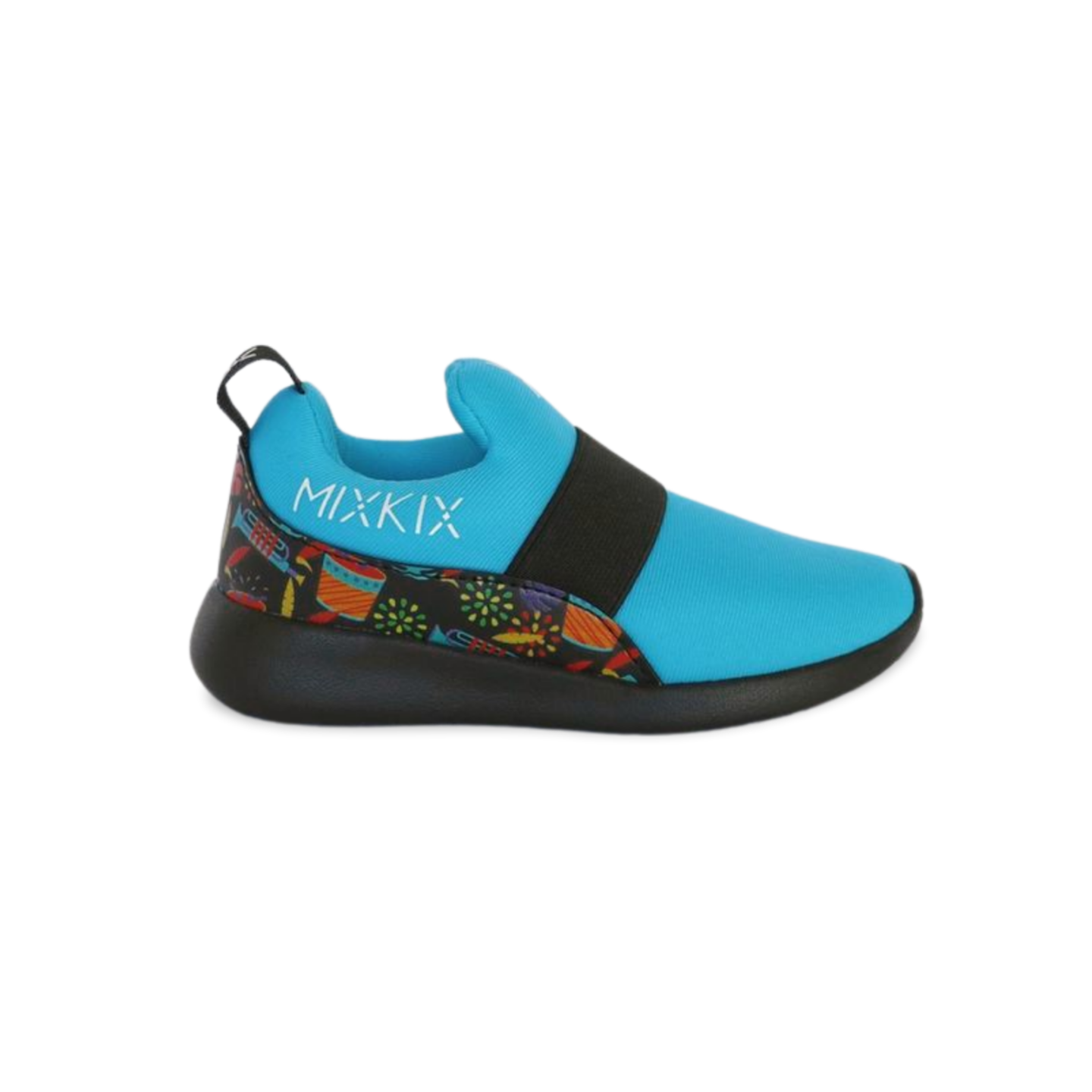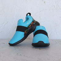 Ready to rock? Picture your little maestro rocking the coolest aqua blue Kix! Our Blue Fiesta Sneakers feature a symphony of musical instruments and tropical plant prints, the perfect sidekick for kids who march to the beat of their own drum.