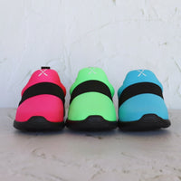 Bright solid coloured slip-on sneakers with stretch mesh fabric for kids and toddlers in pink, blue, and green by Mix Kix.